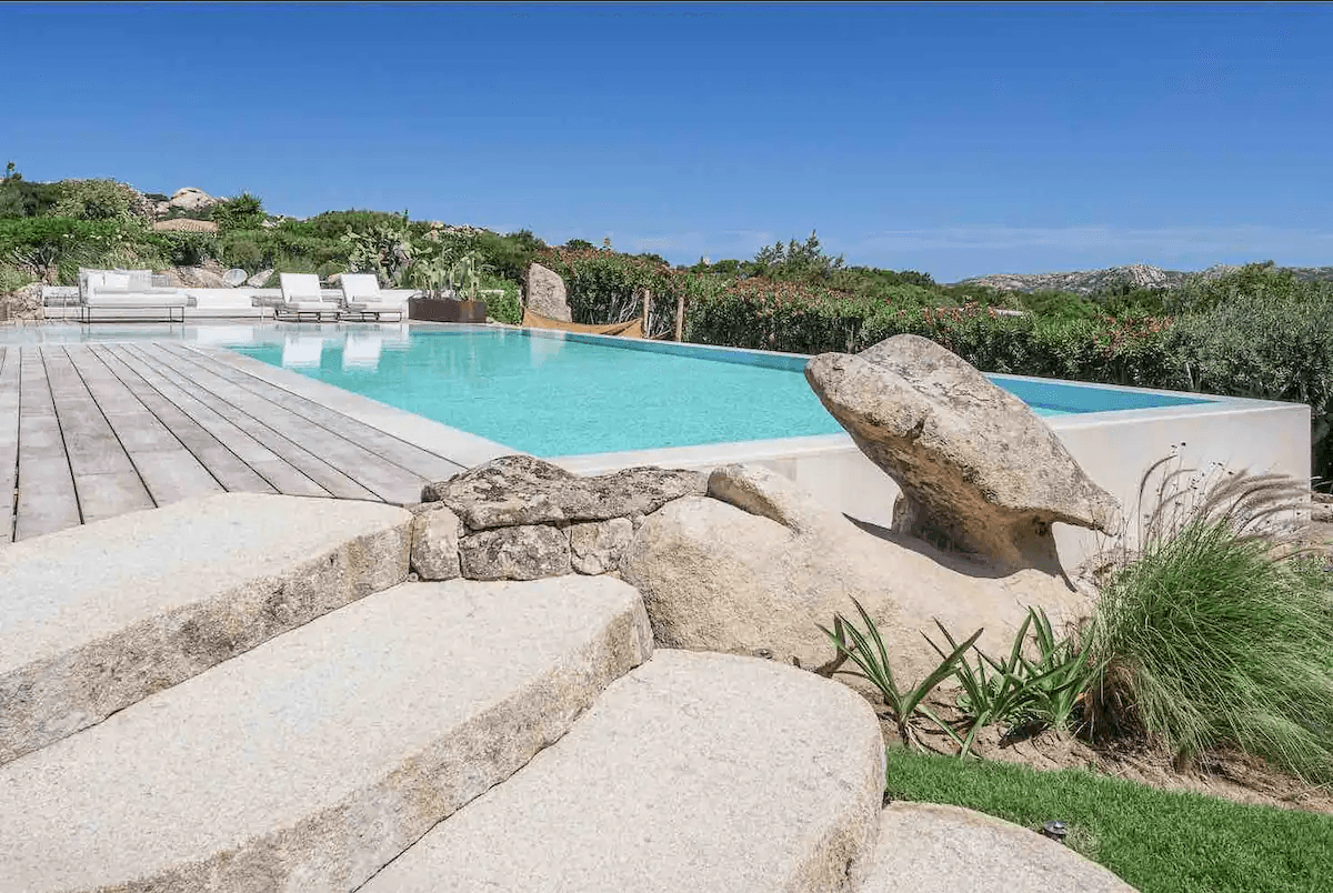 Sie beeindruckt mit ihrem wunderschönen Infinity-Pool, Außendusche, weitläufigen Terrassen und Essbereichen im Freien, sowie üppigem Garten mit Granitfelsformationen und Olivenbäumen- und das mit tollem Blick über das Meer und die Maddalenainseln.